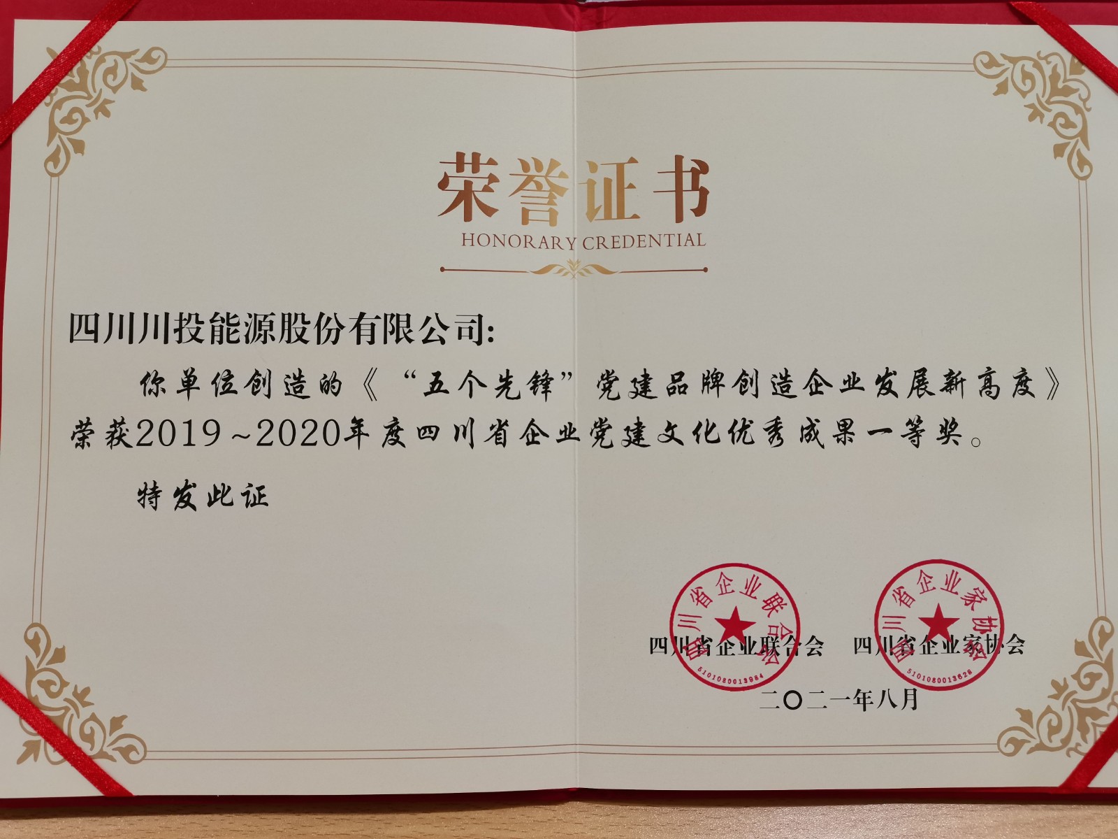 9月10日,四川省第十三屆企業(yè)文化年會(huì)在成都舉行。川投能源公司申報(bào)參評(píng)的《“五個(gè)先鋒”黨建品牌創(chuàng)造企業(yè)發(fā)展新高度》獲得2019-2020年度四川省企業(yè)黨建文化優(yōu)秀成果一等獎(jiǎng),成為5家上榜“一等獎(jiǎng)”的企業(yè)中唯一一家省屬國有上市企業(yè)。