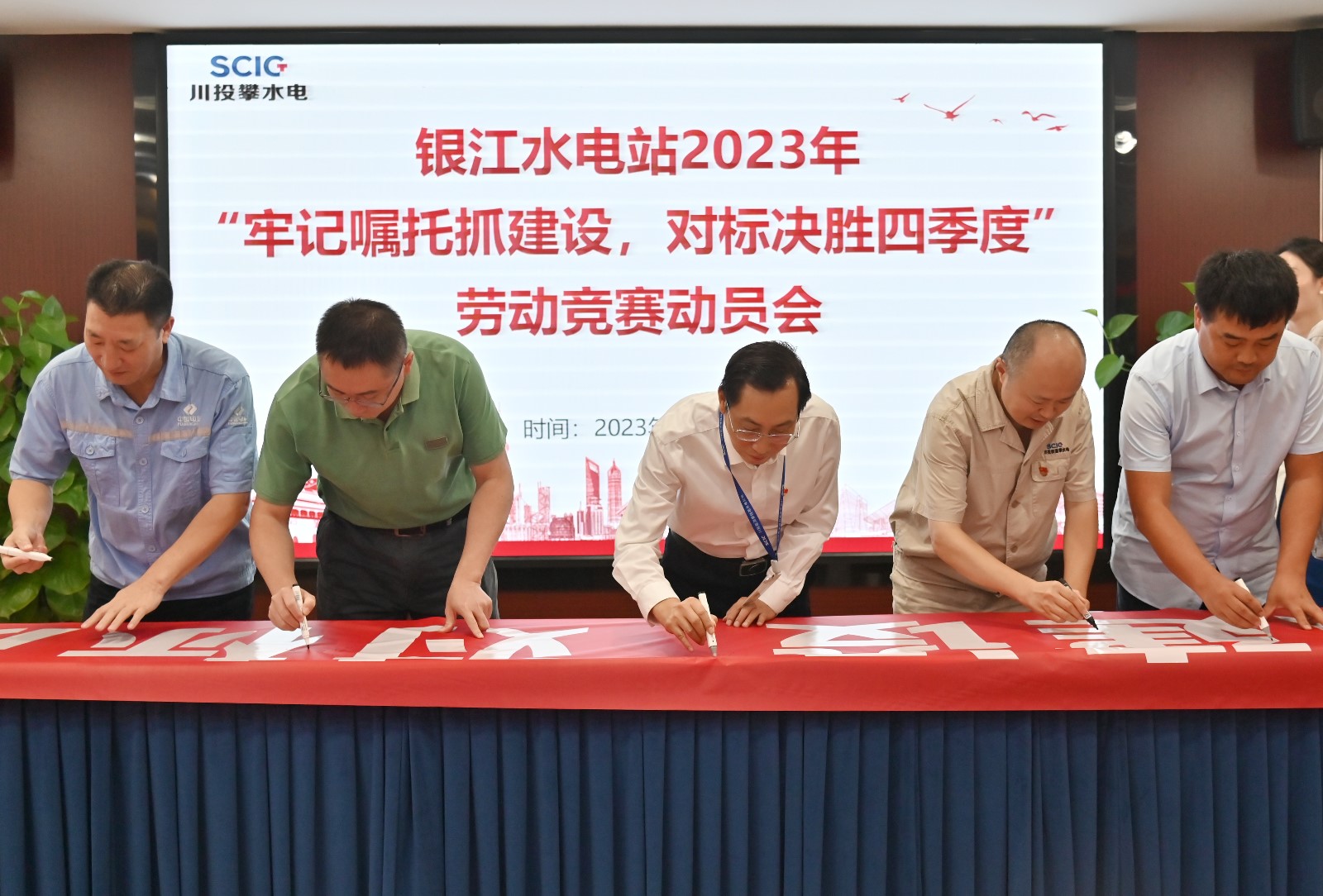 活動最后,大家在印有“牢記囑托抓建設,對標決勝四季度”的勞動競賽宣傳橫幅上簽名承諾,大家紛紛表示,一定按照勞動競賽方案要求,落實落細各項工作舉措,千方百計加快銀江水電站工程建設。