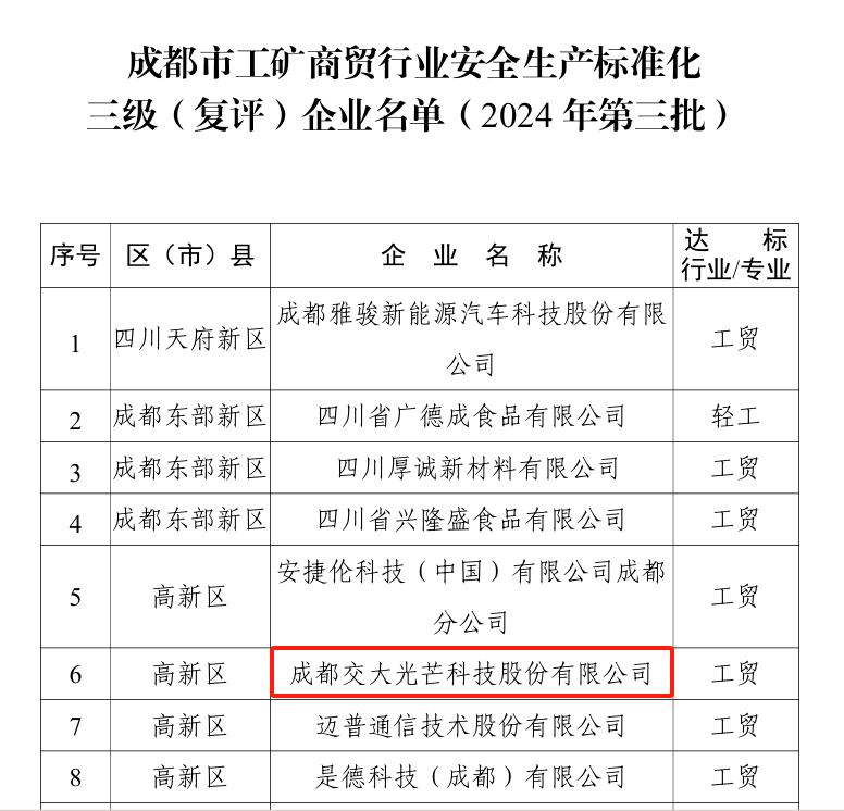 2024年9月,成都市應(yīng)急局發(fā)布《關(guān)于公布成都市工礦商貿(mào)行業(yè)安全生產(chǎn)標(biāo)準(zhǔn)化三級(復(fù)評)企業(yè)名單(2024年第三批)的通知》,交大光芒通過安全生產(chǎn)標(biāo)準(zhǔn)化三級達(dá)標(biāo)復(fù)評。