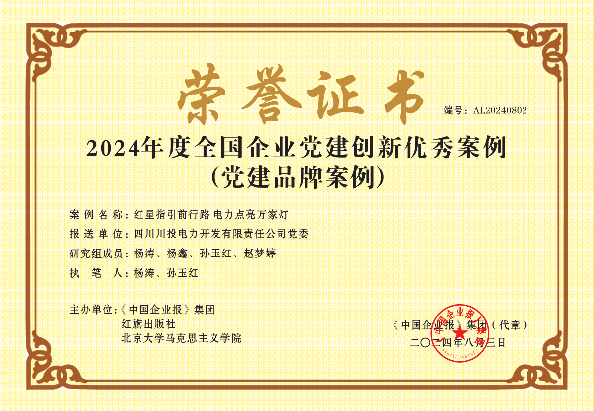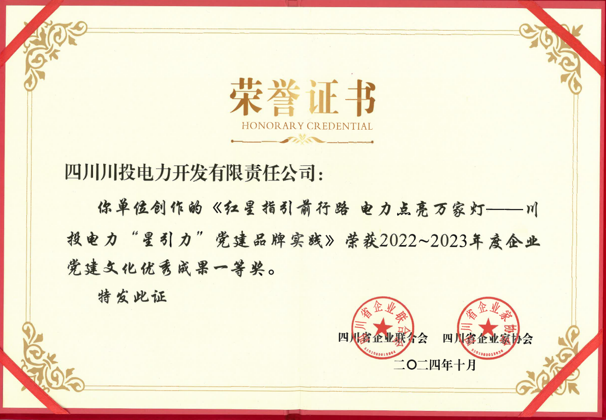 2024年以來,川投電力黨委黨建品牌“星引力”在川投能源黨委的指導(dǎo)下,先后榮獲川投集團(tuán)第四批特色黨建品牌,《中國企業(yè)報》集團(tuán)、紅旗出版社、北京大學(xué)馬克思主義學(xué)院聯(lián)合頒發(fā)的“2024年度全國企業(yè)黨建創(chuàng)新優(yōu)秀案例(黨建品牌案例)”,四川省企業(yè)聯(lián)合會、四川省企業(yè)家協(xié)會聯(lián)合頒發(fā)的“2022-2023年度黨建文化優(yōu)秀成果一等獎”等榮譽。