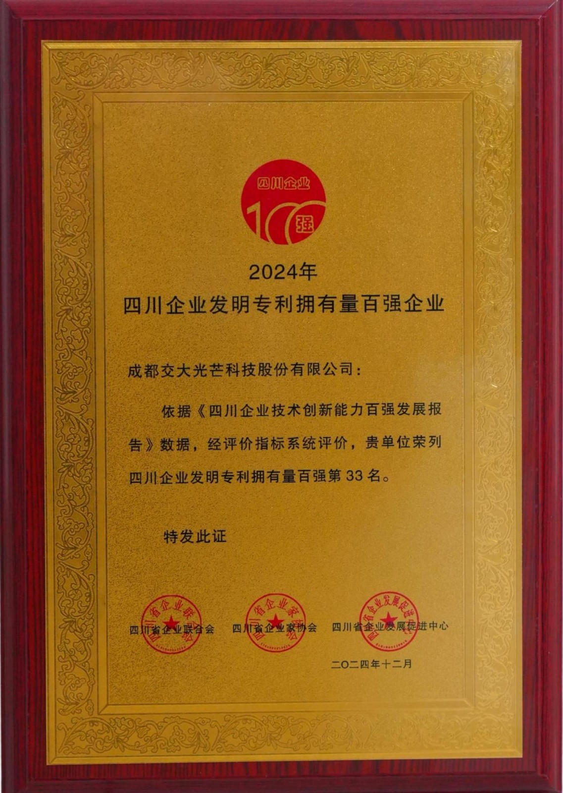 近日,以“技術(shù)創(chuàng)新榮耀四川”為主題的2024年四川企業(yè)技術(shù)創(chuàng)新發(fā)展大會(huì)在成都召開,大會(huì)發(fā)布《2024四川企業(yè)技術(shù)創(chuàng)新發(fā)展能力百強(qiáng)發(fā)展報(bào)告》,川投能源所屬交大光芒榮獲四川企業(yè)技術(shù)創(chuàng)新能力百強(qiáng)企業(yè)(第42位)和四川企業(yè)發(fā)明專利擁有量百強(qiáng)企業(yè)(第33位),這是交大光芒連續(xù)三年獲評(píng)“雙百強(qiáng)”企業(yè)認(rèn)定。大會(huì)還公布了49名企業(yè)技術(shù)創(chuàng)新突出貢獻(xiàn)人物,交大光芒首席專家、副總經(jīng)理陳奇志榮獲“2024年四川企業(yè)技術(shù)創(chuàng)新突出貢獻(xiàn)人物”稱號(hào)。