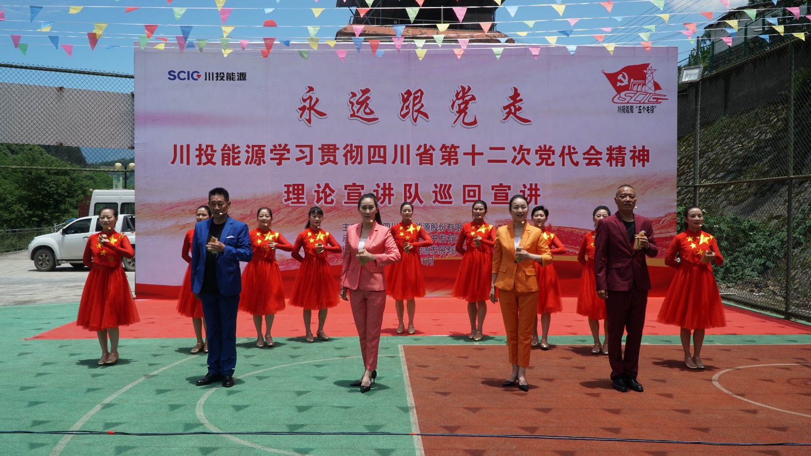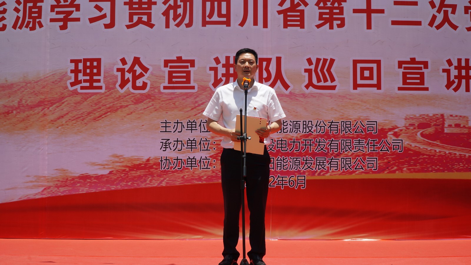 宣講在群山環(huán)繞、瓜果飄香、彩旗飄飄的電廠職工運(yùn)動(dòng)場(chǎng)拉開(kāi)帷幕。在開(kāi)場(chǎng)致辭中,冉蘭平代表川投能源黨委向默默堅(jiān)守在甘洛縣玉田電廠的每一位干部職工表示感謝,也向電廠無(wú)私奉獻(xiàn)、艱苦奮斗,“舍小家為大家”的精神表示致敬。他指出,本次宣講旨在向電廠全體干部職工宣講習(xí)近平總書(shū)記來(lái)川視察重要講話精神和中國(guó)共產(chǎn)黨四川省第十二次黨代會(huì)精神,切實(shí)推動(dòng)省十二次黨代會(huì)精神在基層落地生根。他要求,要學(xué)習(xí)領(lǐng)會(huì)好、宣傳宣講好、貫徹落實(shí)好省第十二次黨代會(huì)精神,將其作為當(dāng)前和今后一段時(shí)期重要政治任務(wù),進(jìn)一步增強(qiáng)“四個(gè)意識(shí)”、堅(jiān)定“四個(gè)自信”、做到“兩個(gè)維護(hù)”,為打造“國(guó)內(nèi)一流清潔能源上市公司”,推動(dòng)治蜀興川再上新臺(tái)階不懈奮斗,以積極飽滿的實(shí)際行動(dòng)和優(yōu)異成績(jī)迎接黨的二十大勝利召開(kāi)。