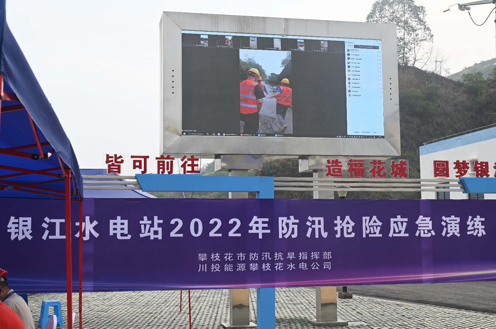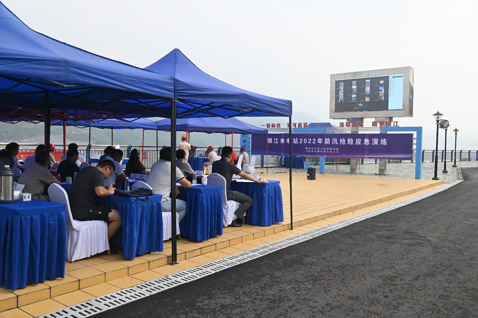 公司全體在攀領(lǐng)導(dǎo)和員工參加了本次演練,市發(fā)展改革委、市應(yīng)急管理局、市自然資源和規(guī)劃局東區(qū)分局、東區(qū)防汛抗旱指揮部、東區(qū)發(fā)改局、東區(qū)應(yīng)急管理局、仁和區(qū)防汛抗旱事務(wù)中心及銀江鎮(zhèn)等單位相關(guān)負(fù)責(zé)同志到場(chǎng)觀(guān)摩指導(dǎo)。長(zhǎng)江設(shè)計(jì)公司、貴陽(yáng)院監(jiān)理部、二灘建設(shè)監(jiān)理部、水電五局項(xiàng)目部、水電七局項(xiàng)目部、水電十局項(xiàng)目部、四川路橋項(xiàng)目部、水情測(cè)報(bào)中心、安全監(jiān)測(cè)標(biāo)等150余人參加了本次演練。