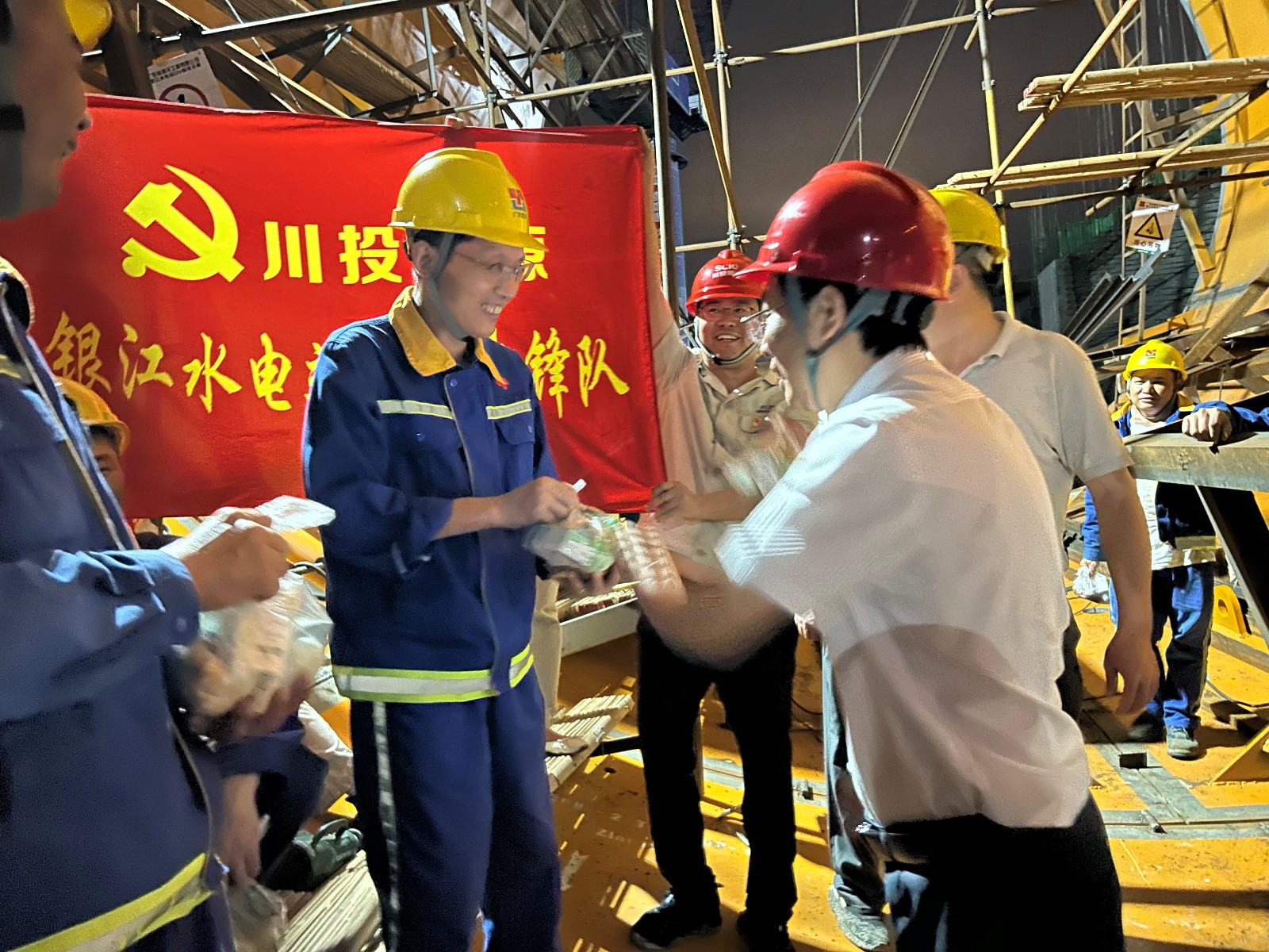 節(jié)日的銀江水電站施工現(xiàn)場,大壩混凝土澆筑、廠房尾水管機電安裝、混凝土拌和系統(tǒng)等各部位一片忙碌,為按期實現(xiàn)各項節(jié)點目標,800余名建設(shè)者依然奮戰(zhàn)在銀江水電站施工現(xiàn)場。夜晚的工地更是燈火通明,晚上九點,川投能源副總經(jīng)理,公司黨總支書記、董事長徐孝剛帶領(lǐng)公司黨員先鋒隊、志愿者服務(wù)隊,深入混凝土澆筑倉面、尾水管、拌合樓調(diào)度室、防汛值班室、變電站、保安亭等部位,將熱乎乎的雞腿、香噴噴的粽子等慰問品送到正在施工的每位工友手上。徐孝剛講到:“端午節(jié)是中華民族重要的傳統(tǒng)節(jié)日,對大家堅持奮戰(zhàn)在銀江水電站施工現(xiàn)場斗酷暑、戰(zhàn)高溫、挑燈夜戰(zhàn)表示感謝,祝福大家端午安康!”活動中,徐孝剛還開展了夜間安全檢查,叮囑大家做好防護、確保施工安全。