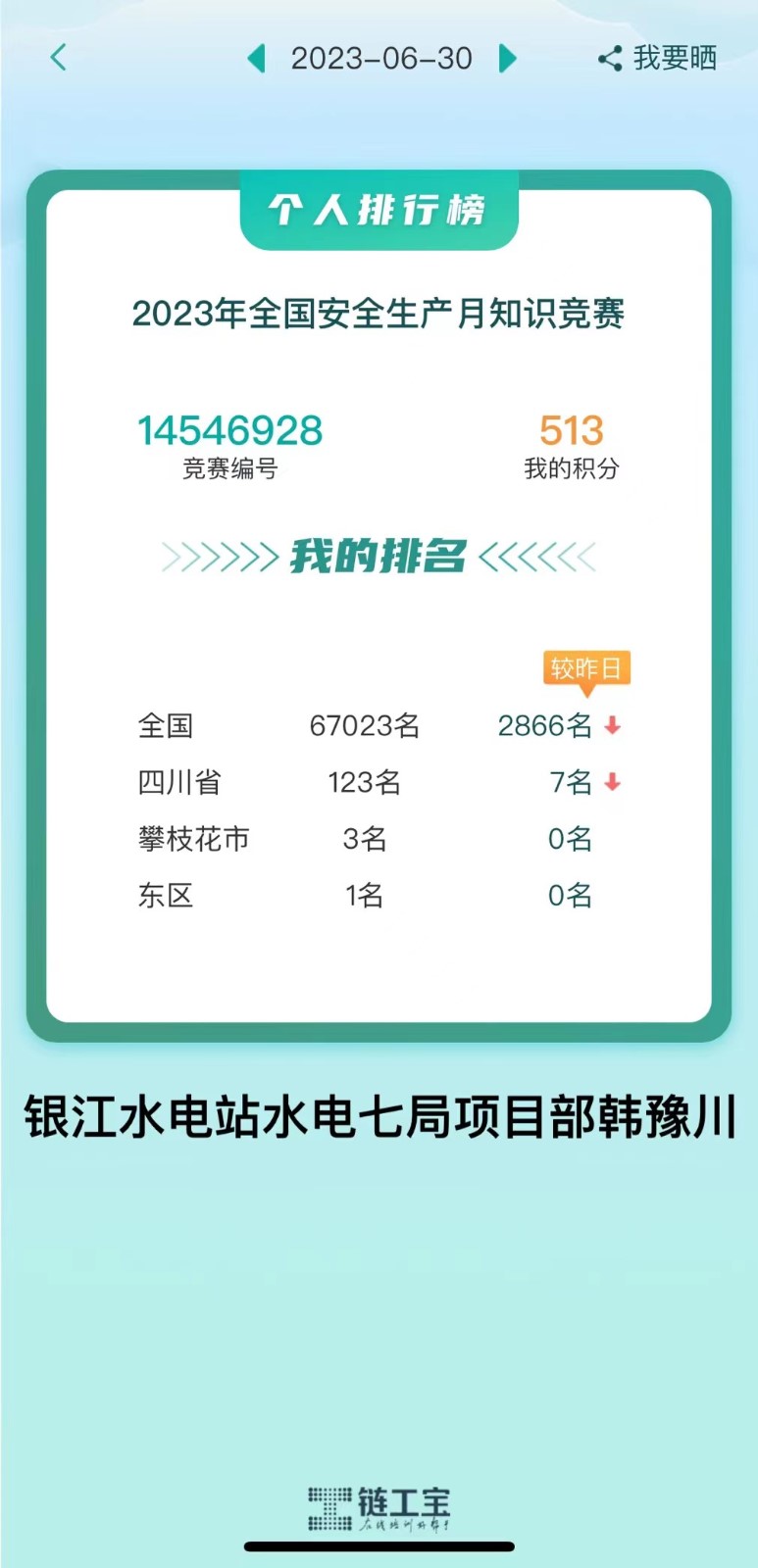 在“鏈工寶”2023年全國安全生產(chǎn)月知識競賽活動中,攀枝花市前10名中,銀江水電站占3人,東區(qū)前10名中,銀江水電站占6人,有效檢驗(yàn)了安全生產(chǎn)月活動成果,充分體現(xiàn)了銀江水電站學(xué)安全、講安全的濃厚安全生產(chǎn)氛圍,進(jìn)一步強(qiáng)化了廣大工程參建人員的安全生產(chǎn)意識。