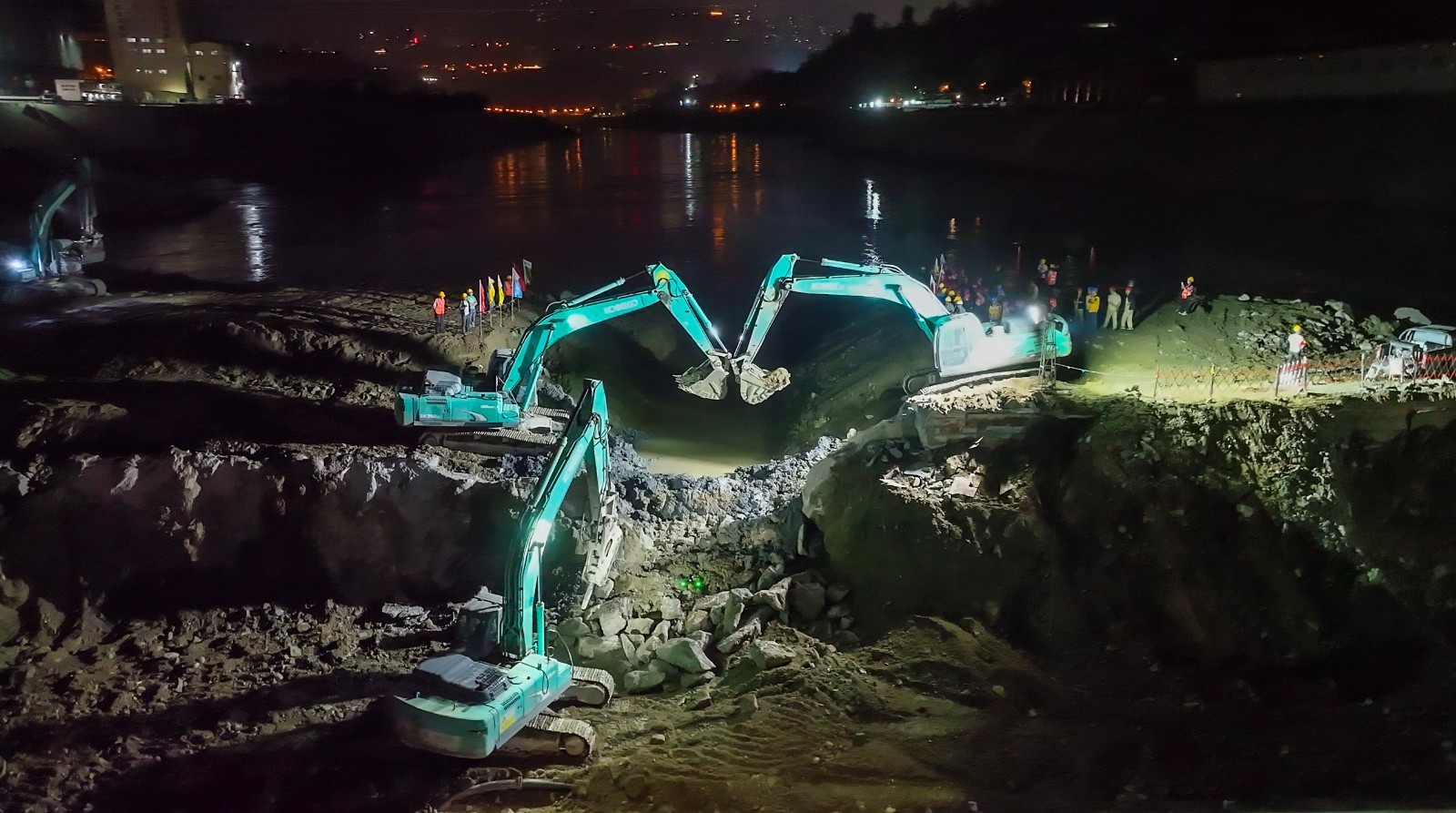 金秋十月,川投能源銀江水電站工程建設(shè)“進度條”持續(xù)刷新。10月25日晚上,隨著川投能源副總經(jīng)理、導流明渠截流指揮長徐孝剛一聲令下,十余臺挖掘機在二期上游圍堰右岸進行破口開挖,奔騰的金沙江水隨即涌入主河床廠房與溢流壩上游,充水平壓后江水經(jīng)溢流壩段流向下游,銀江水電站成功實現(xiàn)分流。這一重要進展為按期完成導流明渠截流打下堅實基礎(chǔ),也標志著銀江水電站首臺機組投產(chǎn)發(fā)電正式進入倒計時階段。